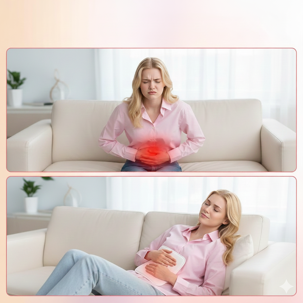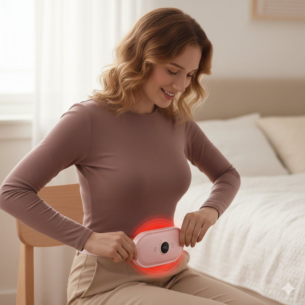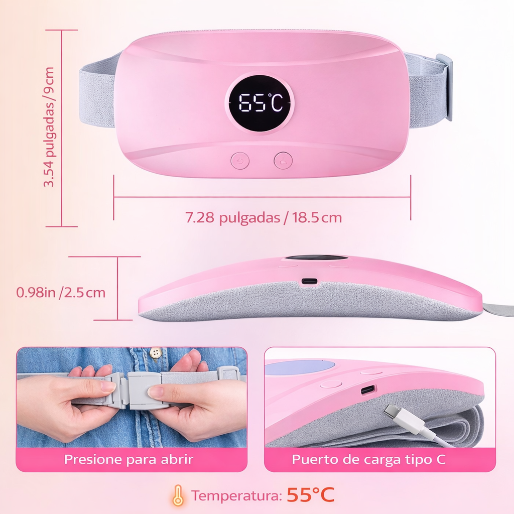 Almohadilla térmica menstrual con calor por infrarrojo lejano y vibración, que alivia los cólicos de forma rápida y natural. Ofrece calentamiento en 3 segundos, 6 niveles de calor, 6 modos de vibración y pantalla LCD para un control total.