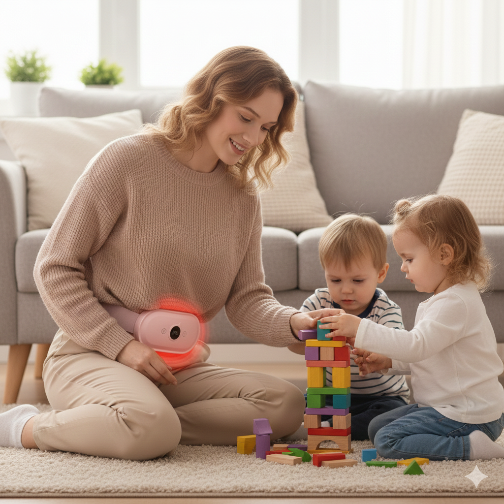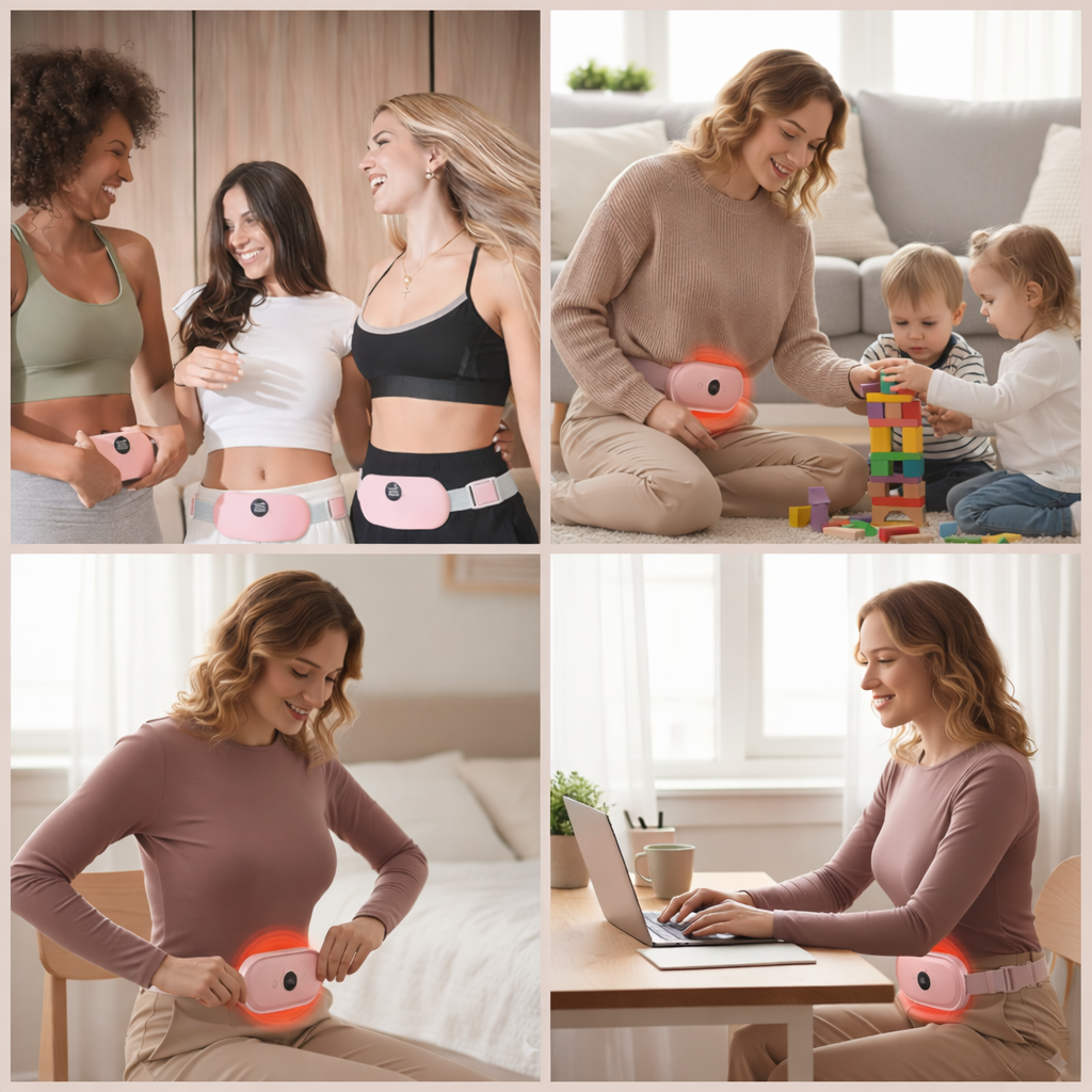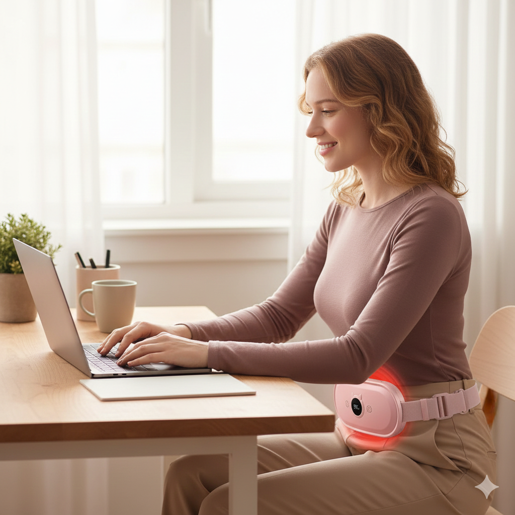 Almohadilla térmica menstrual con calor por infrarrojo lejano y vibración, que alivia los cólicos de forma rápida y natural. Ofrece calentamiento en 3 segundos, 6 niveles de calor, 6 modos de vibración y pantalla LCD para un control total.