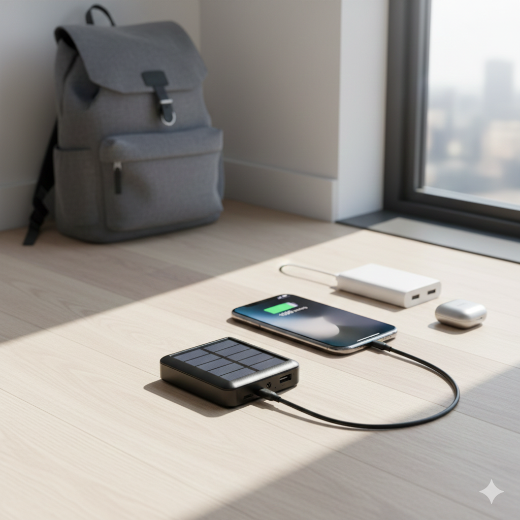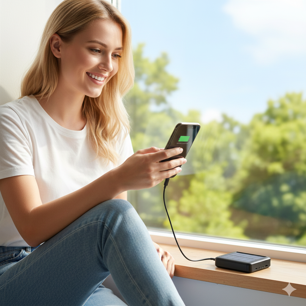 Dispositivo versátil con puerto Type-C que permite cargar teléfonos móviles, power banks, monitores y más. y otros equipos, ahorrando energía y usando una fuente limpia y confiable.