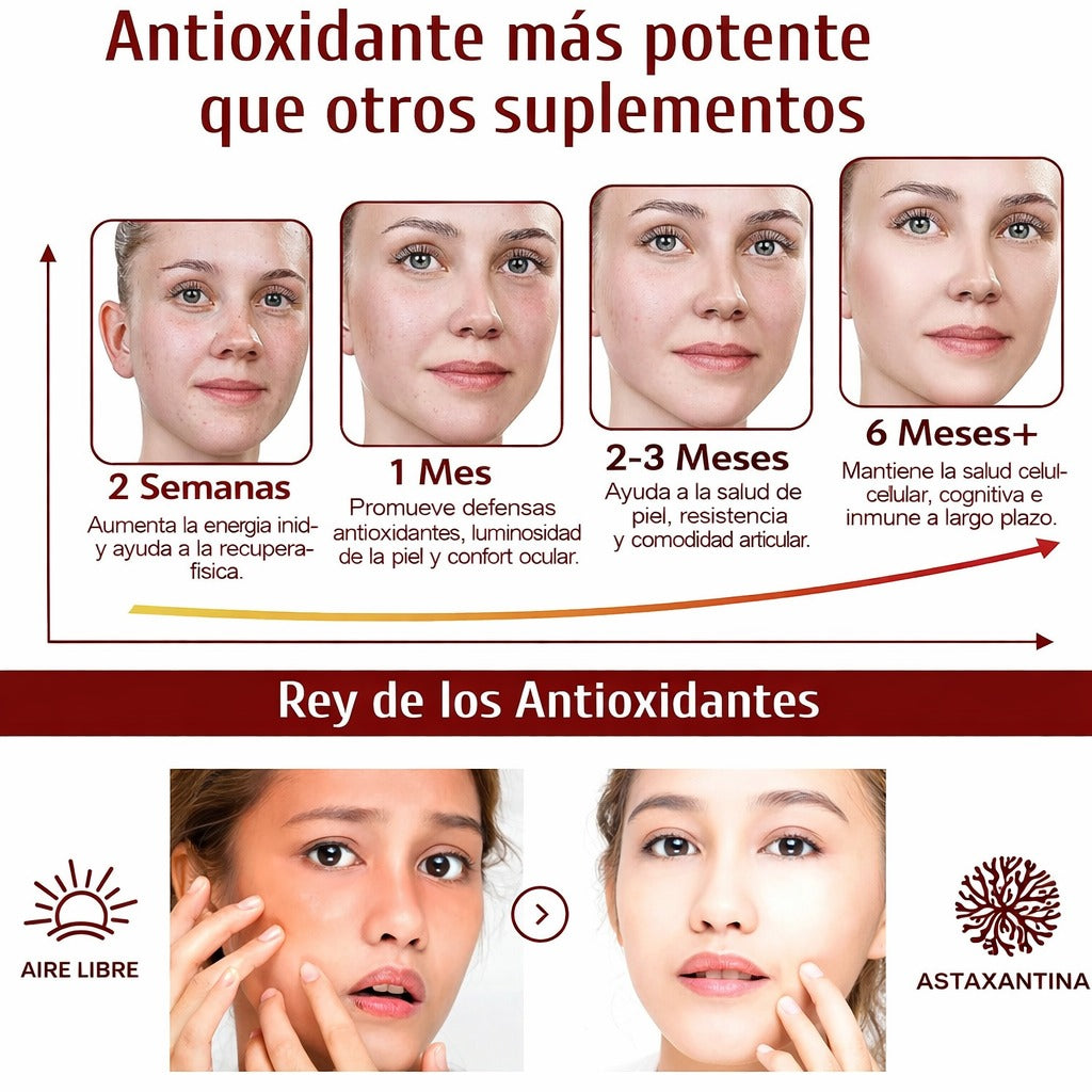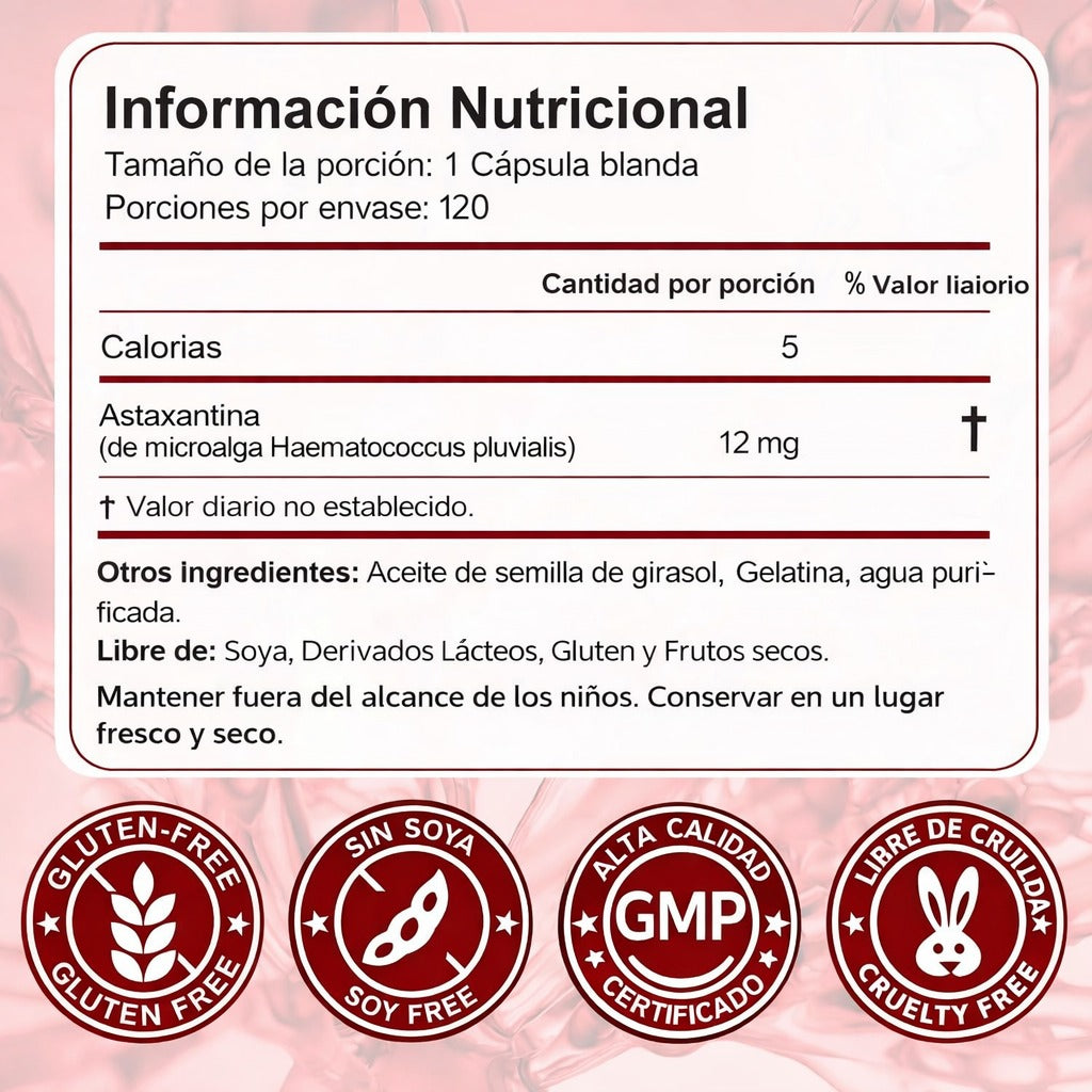 Astaxantina protege la piel del daño oxidativo, ayudando a un rostro más firme y luminoso, y además apoya ojos, articulaciones, circulación y rendimiento físico con una sola cápsula diaria.